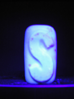 We have been unable to gain a satisfactory explanation for why this soap fluoresces. When hunting for fluorescent objects for this display, the number of items we came across in our bathrooms was rather alarming. A combination of bacteria and cleaning products mean that there lurk all kinds of natural fluorescing growths and artificial whitening agents. The soap on display is clearly fluorescent and contains peppermint, lavender and tea tree oils with alkanet extract.