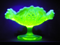 Uranium Glass Fruit Bowl The glass of this fruit bowl, sometimes called Vaseline Glass, contains traces of uranium oxide and originates from Australia C.1950. The uranium is what gives the glass a yellow appearance under white light and provides the vivid green fluorescents under ultraviolet light. The presence of uranium also means that it is a mildly radioactive object, though it posses no risk to health in these circumstances.