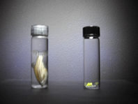 Green fluorescent protein (GFP) is a naturally accruing protein in the bioluminescent jellyfish, Aequorea victoria. In recent years GFP has become somewhat of a celebrity within the world of genetic engineering and biological research for it has been extracted from this jellyfish and engineered into the cells of other animals. High profile images of 'glowing' rabbits, pigs and mice, bring the fluorescent reality of GFP into the headlines and overshadow the subtleties at work. At first glance, this Zebrafish appears unremarkable; it is only the vial of concentrated GFP that is displayed next to it that hints at the wonders of the fish's genetic make-up. One cannot see the fluorescence of this fish is because it is designed to be view under a microscope, thus the levels of fluorescence are not required to be visible with the naked eye. The reason this fish has been engineered to express GFP is so that the growth and development of embryo cells can be made visible, under ultraviolet light, to biologists. This allows the development of an understanding of how cells form, divide and mutate, bringing us closer to an understanding foetal deformities and genetic anomalies.